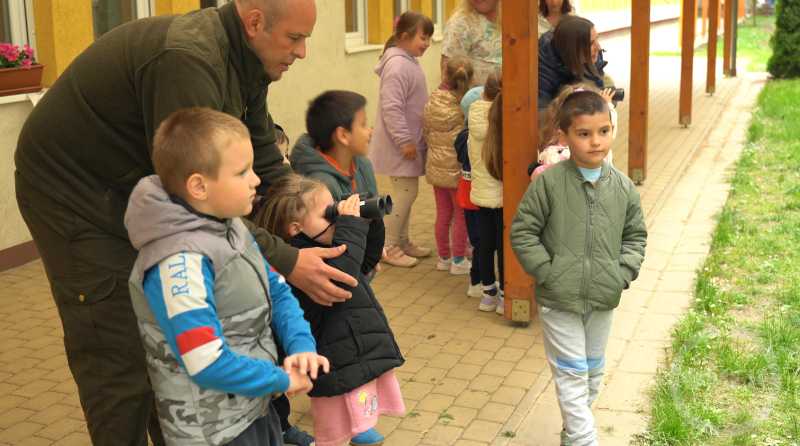 Távcsővel keresték a madarakat a Nemzetőr Úti Tagóvoda Süni csoportjába járó gyerekek. Először meg kellett találni a madarakról készült képeket, amiket korábban Tölgyesi Gergő erdei iskolavezető rejtett el az udvaron. A legtöbbet a fák törzsére helyezte, de volt olyan is, amit a mászókára. Miután meglett mind, a gyerekek közelebb szaladtak a képekhez. Mindegyik madárról tanultak valamit. Az erdei iskolavezető a madarak és fák napja miatt érkezett az óvodásokhoz.